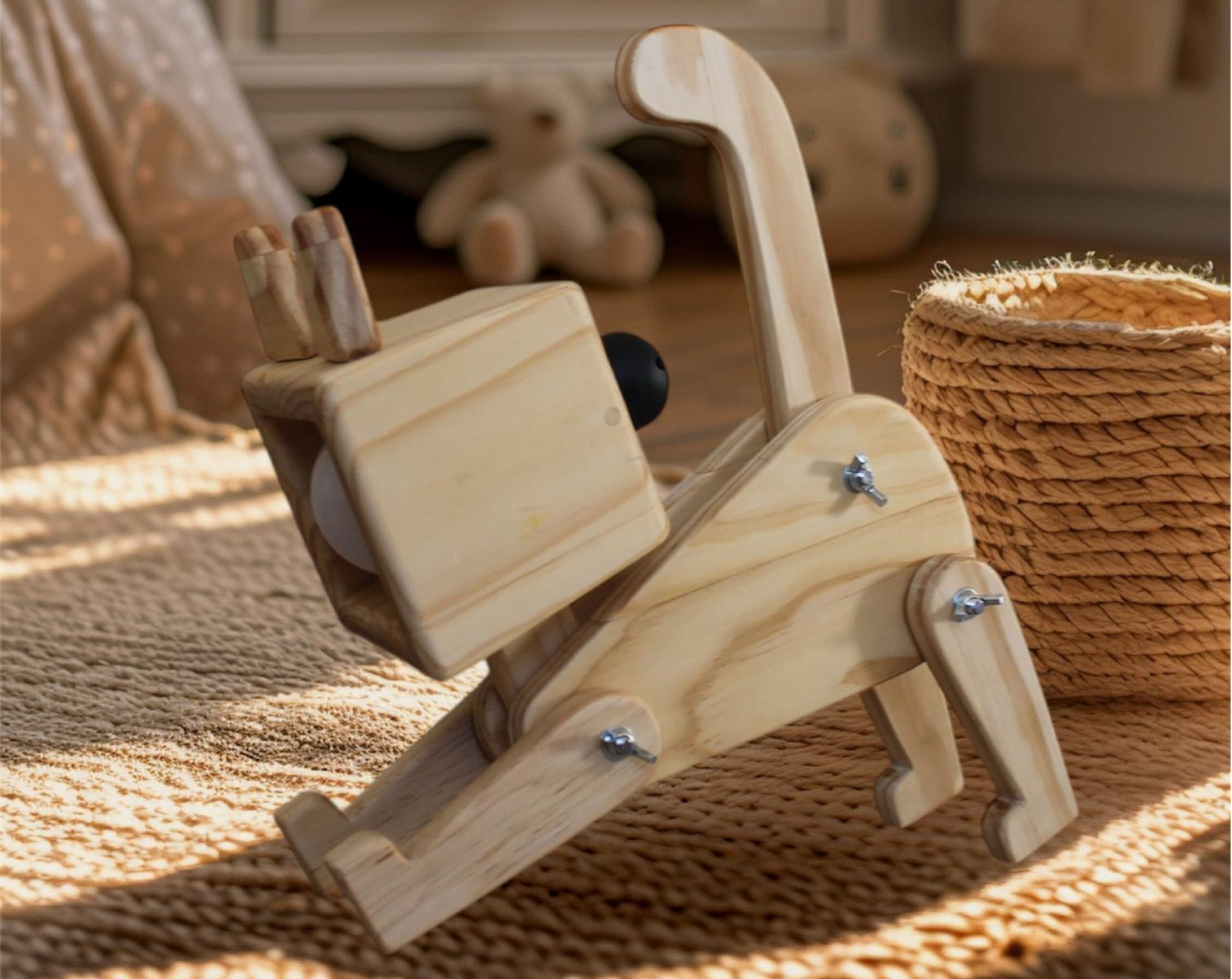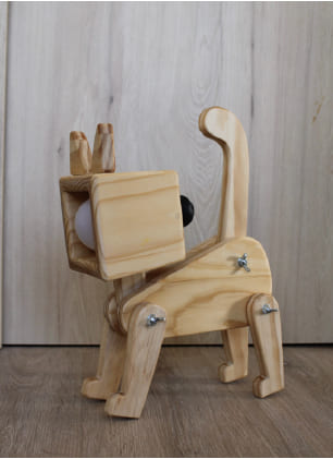 Se trata de una lámpara con forma de gatito divertido hecho en madera masisa de pino. Gracias a sus patas y cuello articulados, el gato puede adoptar diversas posturas, de modo que puedan “darle vida” moviéndolo a su antojo. Es perfecto como luz de noche o lámpara de escritorio en un dormitorio infantil: ilumina suavemente la habitación mientras el gatito juega el papel de compañía.