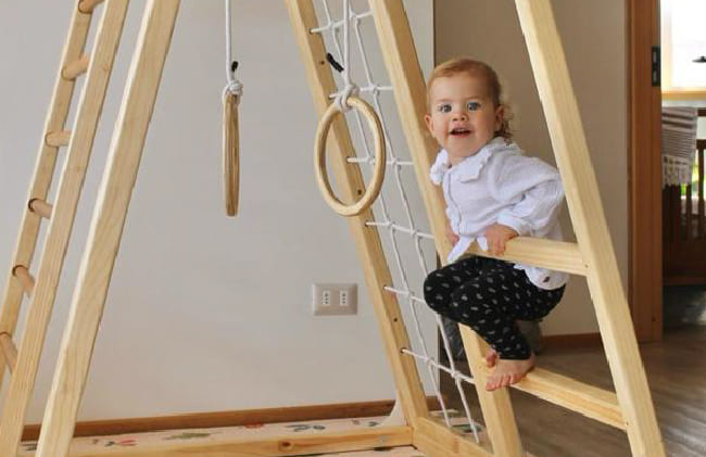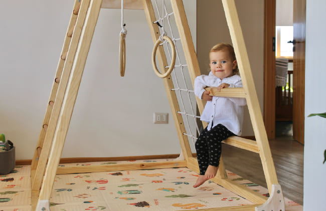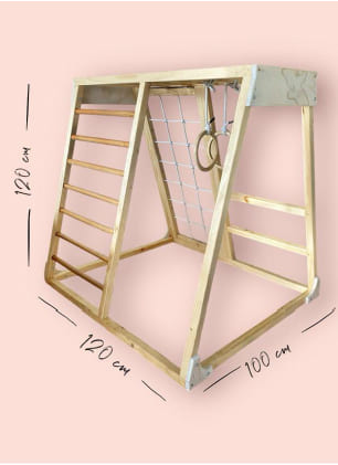 Este conjunto escalable de madera de pino, es un parque de juego interior estilo Montessori, diseñado para el desarrollo motriz infantil. Consiste en una estructura con varios peldaños o barras horizontales de alturas crecientes que el niño puede subir y bajar libremente. A una temprana edad (alrededor de 1 año), el bebé puede sentarse en la base, y conforme crece (hasta 5–6 años) puede trepar por los niveles más altos.